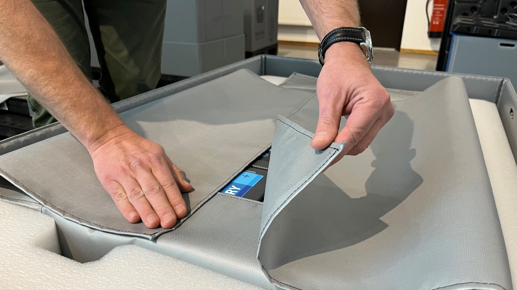 Wellplast® FIRE PROTECT är ett avancerat, brandsäkert textil (klass A2-S1 enligt EN ISO 13501-1:2018) speciellt utvecklat för trygg transport av litiumjonbatterier med gul klassificering. Tillverkat av slitstarkt silikon och glasfiber med en hudvänlig yta vilket göra att handskar inte behövs vid hantering.